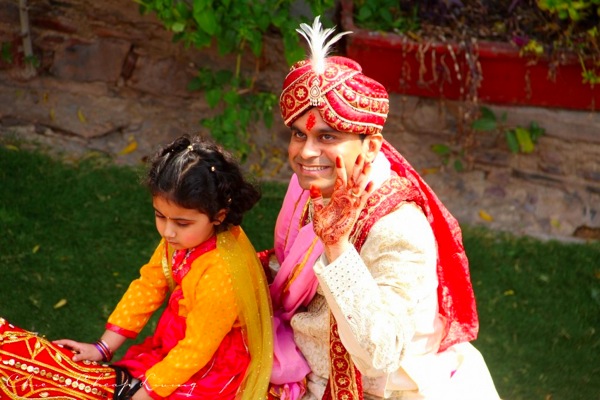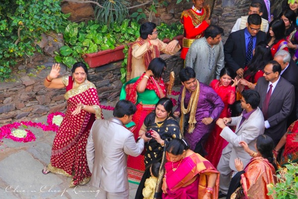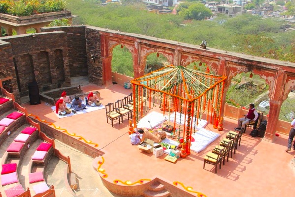 What do you imagine when you picture an Indian wedding?If you envision vibrant jewel tones, contagious singing and dancing, and a visual delight of ceremony and fashion you are right on! This was actually the fifth Indian (Hindu) wedding I’ve attended but my first one in this region. The wedding venue, Neemrana Fort-Palace, only added to the romantic vibe of the occasion. The beautiful arches and architecture hailed from 1464 and have been restored in beautiful detail. Â I’ll write a separate review about the Fort because it was really lovely. Â It was quite an experience walking on such lovely and historic grounds. Â The warm colors and grand spaces just enhanced the beauty of the wedding itself (really when will you witness a wedding in an amphitheater?!)
